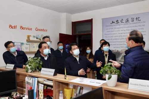 在山东交通学院,邓云锋一行经过非接触式体温检测后进入校园,检查了学校大门口管控工作,叮嘱工作人员要管控好学校大门这校园第一关口。随后,邓云锋一行实地查看了留学生管理工作办公室、留学生宿舍、厨房、线上课堂等。邓云锋用英语与留学生代表进行交流,鼓励他们认真学习,做好个人疫情防控,安排好假期的学习和生活。邓云锋深入了解了校园管理、公寓餐厅管理、值班值守、安全隐患排查整改等工作。他强调,当前疫情防控形势依然严峻复杂,假期期间学校尤其要高度重视疫情防控工作、安全隐患排查整改工作和留校学生关爱、管理及生活保障工作,加强联防联控和应急处置,抓细抓实各个环节,确保校园安全稳定。学校党委书记王焕斌,党委副书记、院长陈松岩介绍了相关工作情况。