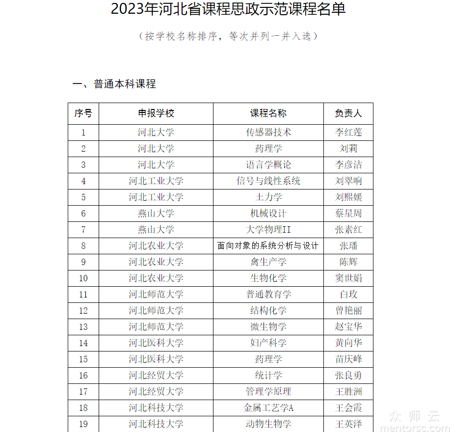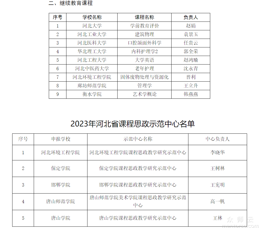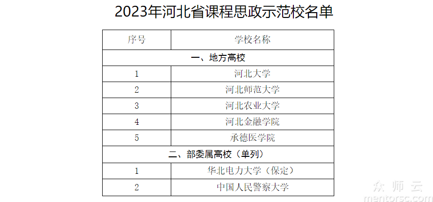 根据河北省教育厅《关于评选 2023年“五个一批”课程思政建设项目的通知》要求,经学校申报、专家评选,初步评出课程思政示范校7个(部委属院校单列)、课程思政示范课程80门(等次并列的一并入选)、课程思政示范中心5个。现将名单予以公示。公示期为2023年11月20日-24日(5个工作日)。公示期内,如有异议,请本着实事求是原则,以传真形式书面向省教育厅高等教育处实名反映,并提供联系电话和有关佐证材料。